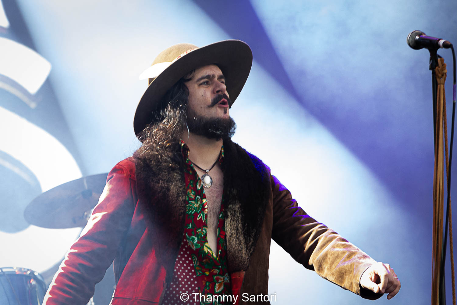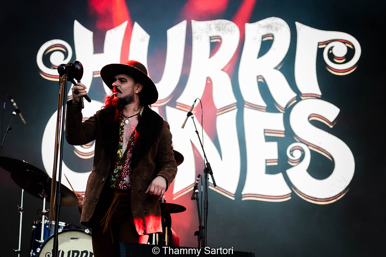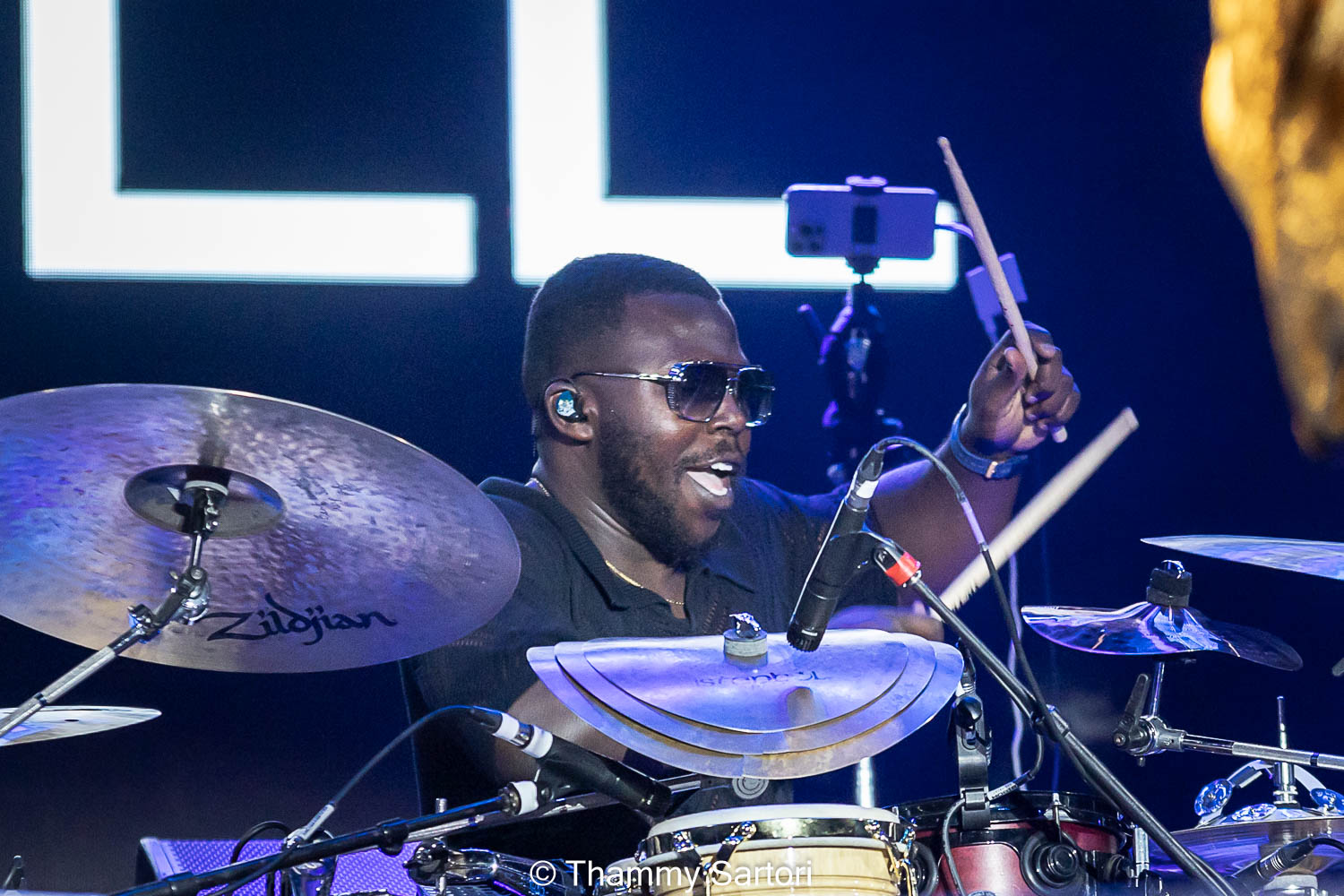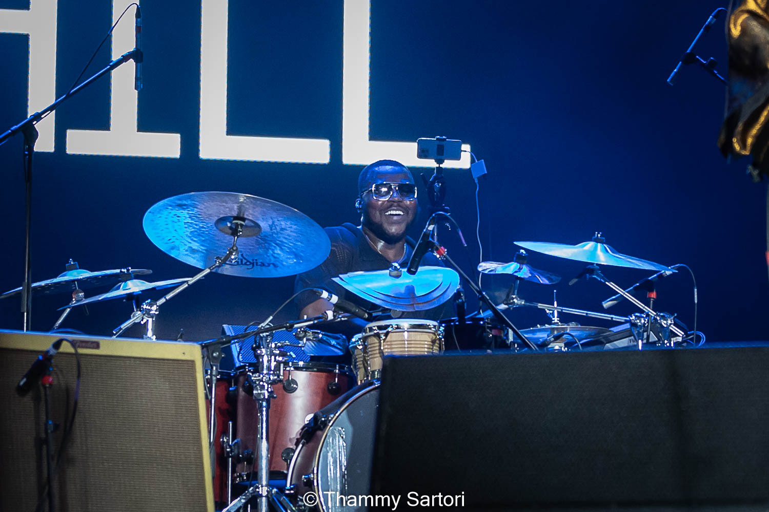Nos momentos em que o vocalista não estava cantando, ele se encontrava ao fundo do palco, tocando sua meia lua e sorrindo o tempo todo para os fãs.