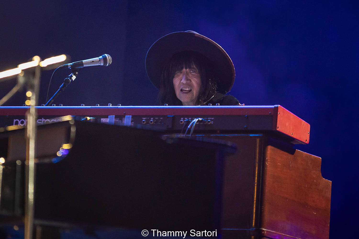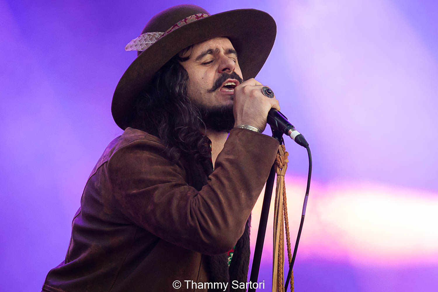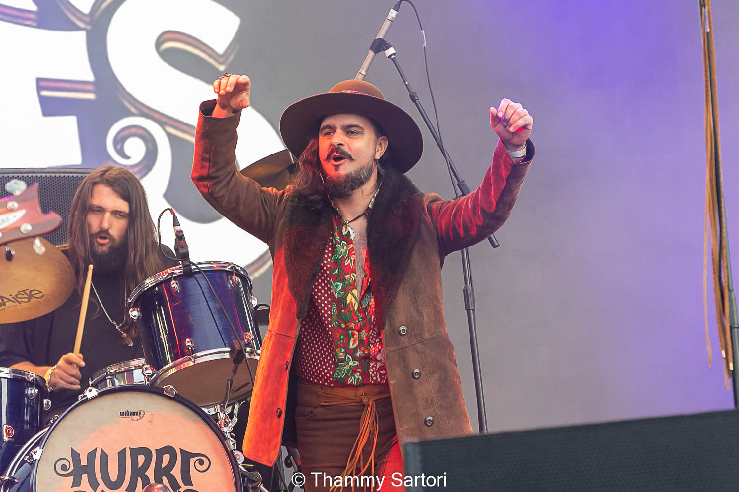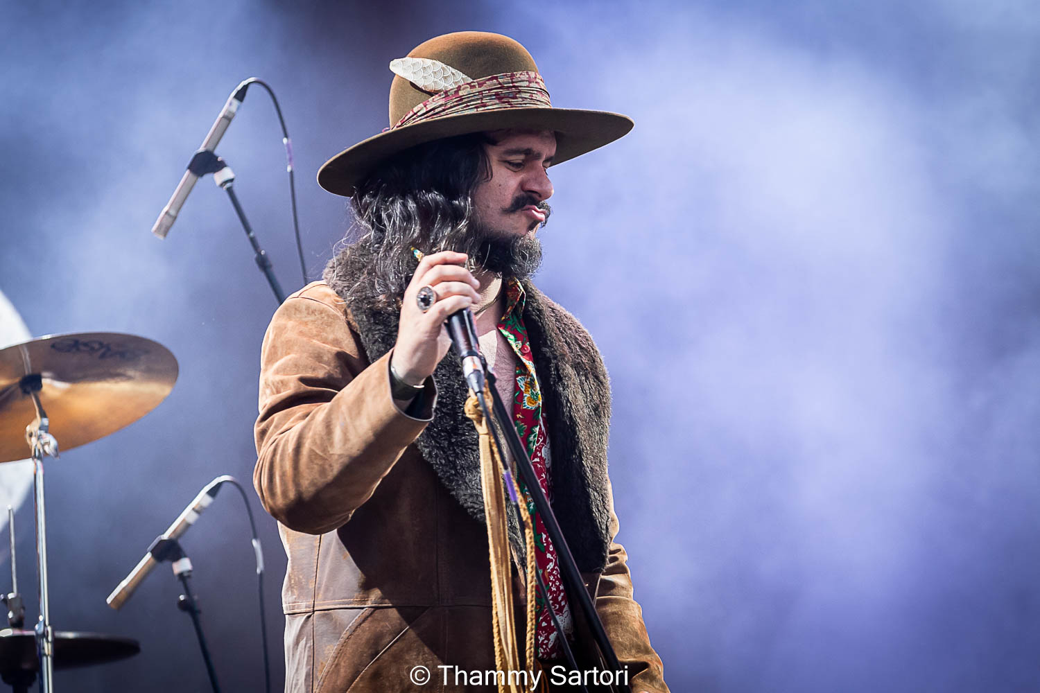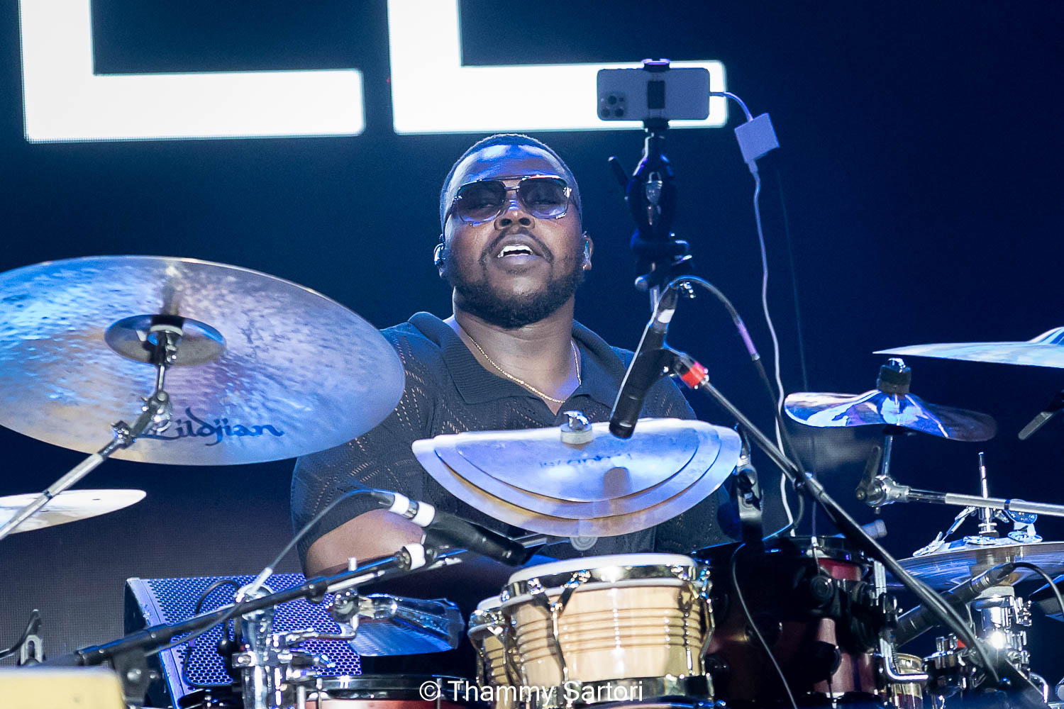 Nos momentos em que o vocalista não estava cantando, ele se encontrava ao fundo do palco, tocando sua meia lua e sorrindo o tempo todo para os fãs.